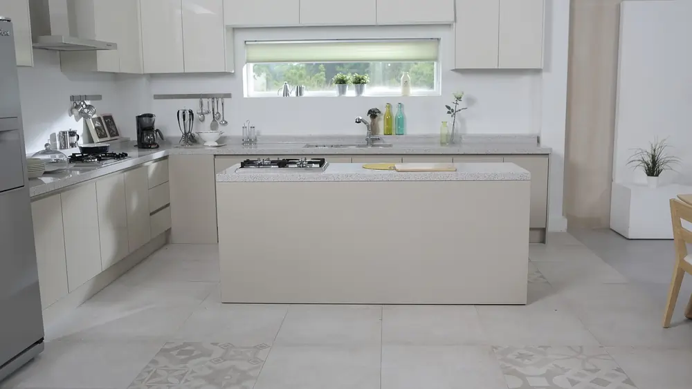 In a white floor open concept kitchen, porcelain tile and white floor create a seamless flow. An L-shaped porcelain tile and white layout can be perfect for an interior design that incorporates black accents and white and silver elements.